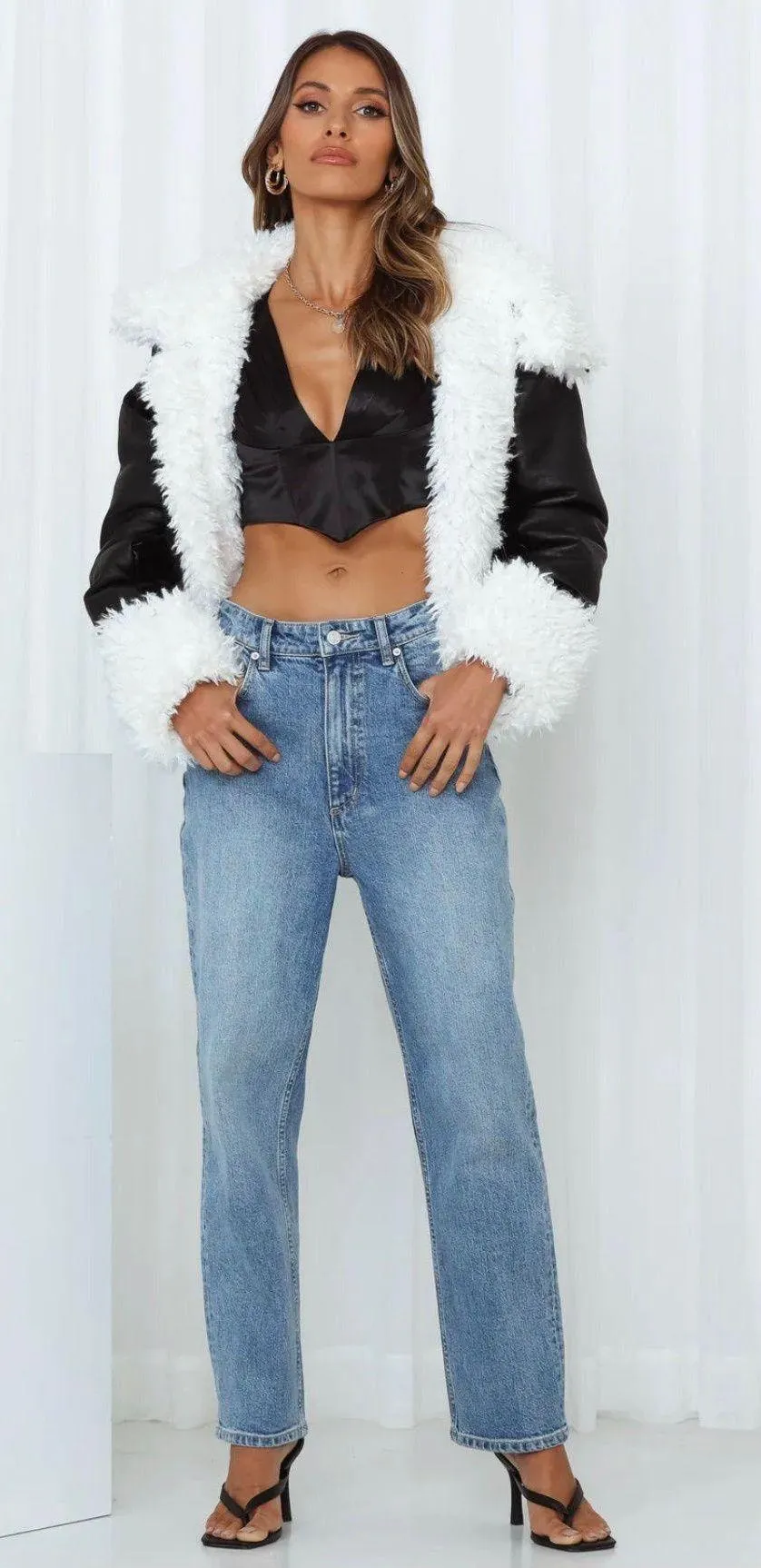 Length from shoulder to hem of size S: 63cm. Faux fur collar, lining and cuffs. Faux leather outin... Show more