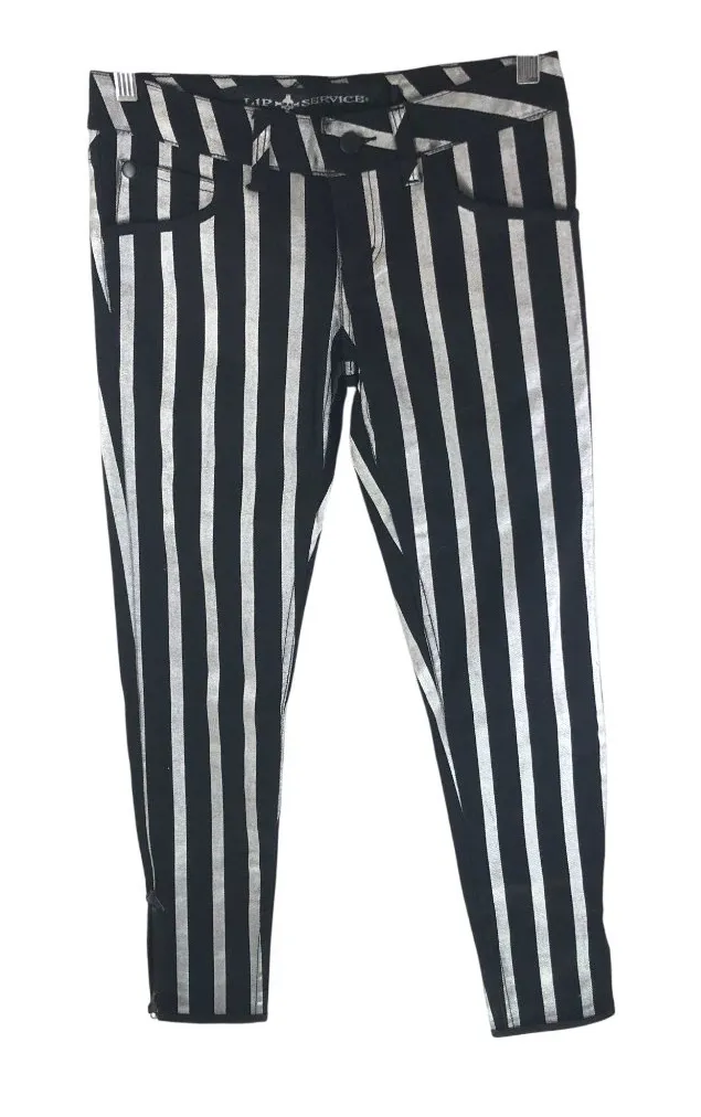 Showroom sample but new without tags! Measurements (approximate): Waist: 15.5" Front Rise: 7.5" Inseam: 28" Comes from a smoke free home. Feel free to ask any questions you may have. Thanks for looking! Skinny jeans with bold black and white stripes. Ankle zippers add a touch of edginess. A versatile piece for a stylish wardrobe. • Black & silver stripes • Skinny fit • Ankle zippers • Button & zip closure