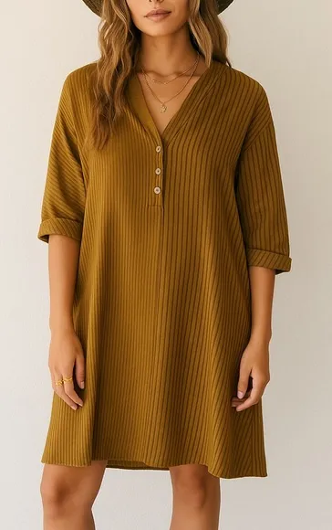 size L. Effortlessly chic with an artful edge, this Lisa Bayne oversized tunic dress is crafted from a breathable linen blend and features subtle green and gold pinstripes for elevated texture. Designed with a relaxed laggenlook silhouette, flattering V-neckline, and functional pockets, this knee-length tunic is perfect for casual days, travel, or layered bohemian styling. ✔️ Lightweight linen blend fabric ✔️ Oversized, loose-fit tunic silhouette ✔️ V-neckline | Short sleeves ✔️ Asymmetrical shift-style design ✔️ Functional pockets ✔️ Size Large ✔️ Excellent condition, no flaws ✔️ Smoke-free home Measurements Length (shoulder to hem) - 42” Width (armpit to armpit) - 23” A versatile boho tunic dress that pairs effortlessly with leggings, sandals, or statement accessories—ideal for laggenlook, minimalist, or artsy everyday wear.