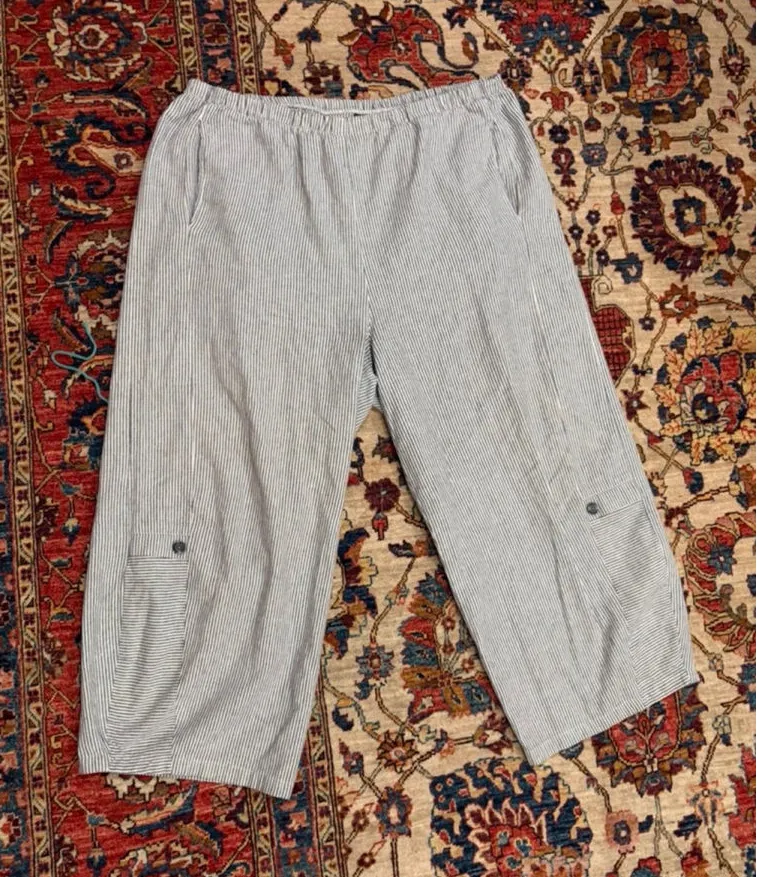Easy-breezy striped crop pants from Lisa Bayne, made in the USA in a soft linen/cotton blend. Lightweight, comfy pull-on style with pockets and button-tab hems. Perfect for effortless warm-weather dressing — think beach walks, gardening days, and relaxed weekend outfits. Wear with a tank and sandals in summer or with a slouchy knit for spring coastal vibes. DETAILS • Brand: Lisa Bayne • Style: Striped crop pants • Color: Navy/white micro stripe • Size: Large • Fabric: 55% Linen / 45% Cotton • Made in USA • Features: Elastic waistband, side pockets, utility button tabs, casual coastal style • Condition: Great pre-owned with light natural wear consistent with linen blend fabrics KEYWORDS cottagecore, coastal grandma, beach vacation, travel pants, summer staple, casual linen blend, minimalist wardrobe, everyday comfort DISCLAIMER Approximate measurements in photos. Color tone may vary slightly by screen.