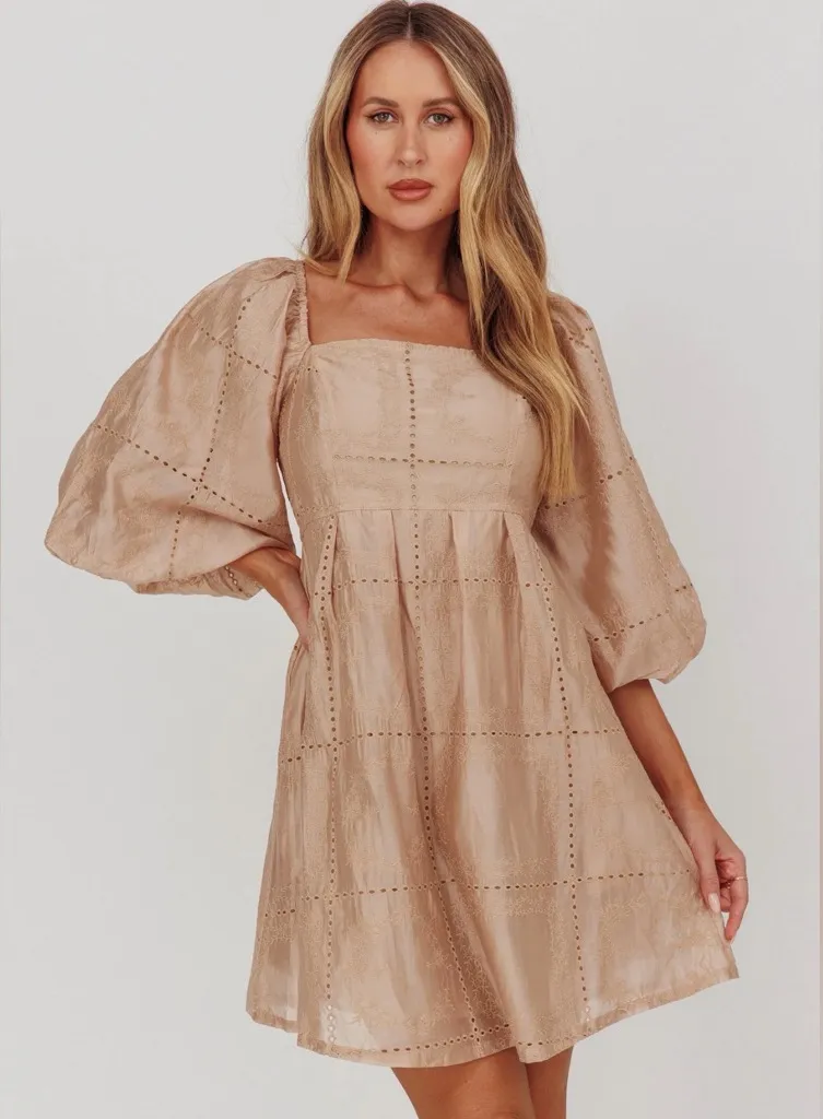 Listicle Champagne Beige Embroidered Eyelet Square Neck Puff Sleeve Dress Size Small NWT. Has pockets! Came from the Wide Brim boutique in Ft. Worth, TX. Mini dress. Lined. Balloon sleeves. Back tie. Pretty, eyelet embroidery detail and playful puff sleeves. Perfect for weekend brunch dates or sunny day picnics with your besties. Hand Wash Cold. Do Not Iron. TENCEL/POLYESTER. New with tags.
