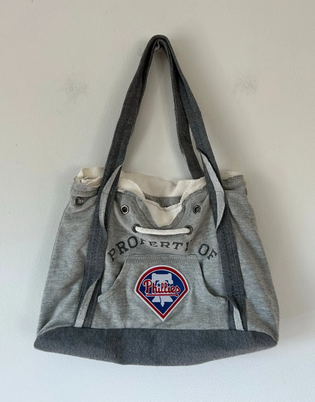 Show off your Phillies pride with this unique Little Earth hoodie sweatshirt bag! This gray bag is made from a repurposed hoodie and features the Phillies logo. It's perfect for carrying your essentials while showing your team spirit. Features: - Brand: Little Earth - Team: Philadelphia Phillies - Color: Gray - Material: Cotton/Polyester blend - Style: Hoodie Sweatshirt Bag - Officially licensed MLB product Condition: Excellent pre-owned condition.