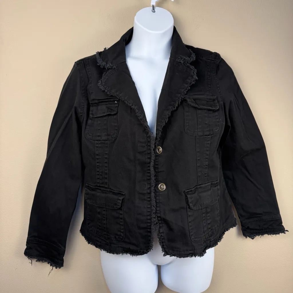 Live A Little Black Fringe Raw Hem Cotton Spandex Blend Stretchy Denim Jacket Large See pictures fo... Show more
