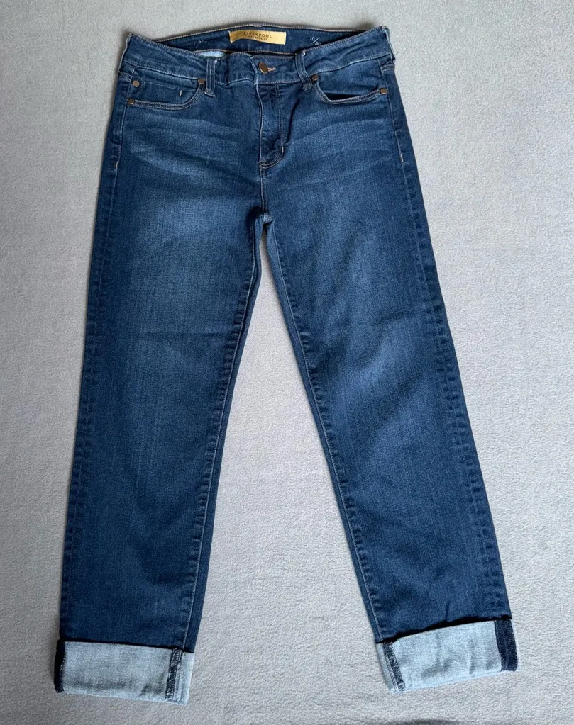 Stylish dark blue stretch jeans by Liverpool. Liverpool jeans company Capri sewn cuffed leg design. Size 10/30 Approx inseam 23” See photos for measurements Excellent preowned condition