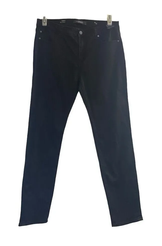 BRAND: Liverpool Jeans Company COLOR: Black CONDITION: Pre Owned *** HAS SOME WHITE SPECKS ON BOTH LEGS SEE PICTURES ** SIZE: 12 MEASUREMENTS: See Pictures MATERIALS: 73% Cotton, 26% Polyester, 2% Spandex OTHER DETAILS: 5 Pockets with Rivets Zipper & Button Closure Belt Loops Please see approximate measurements in pictures before purchasing. Use your own judgment as to the fit.