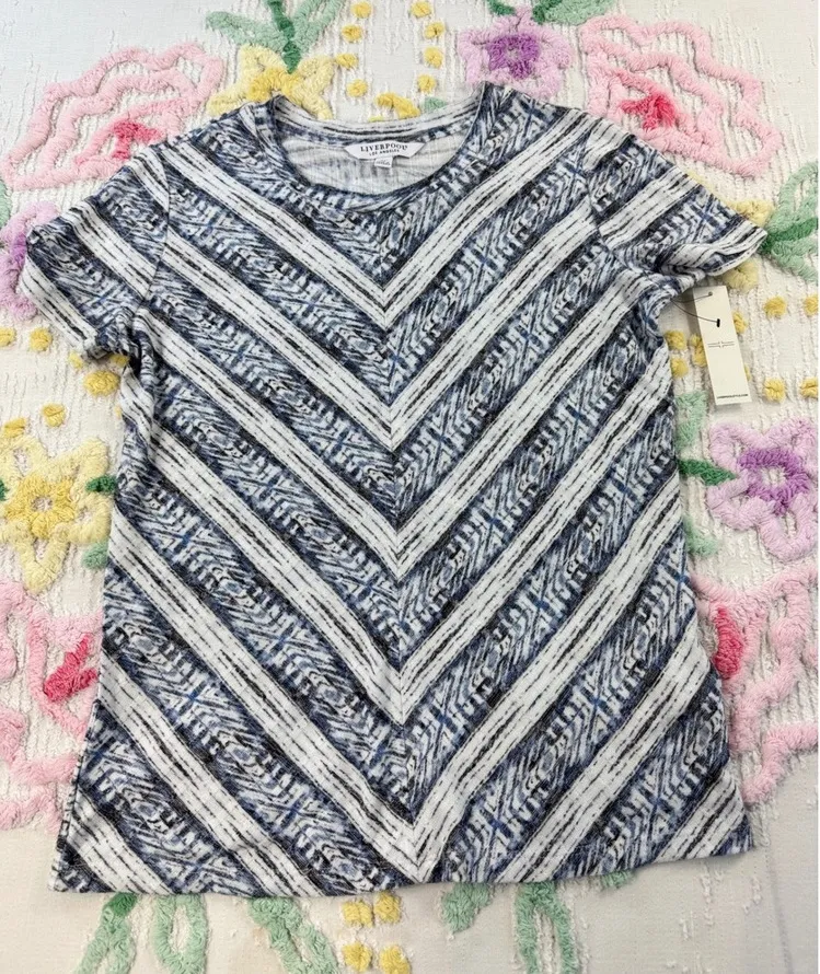 Embrace effortless style with this chic Liverpool Los Angeles petite knit top, designed to elevate your everyday wardrobe. The captivating chevron print, a mesmerizing dance of blue, black, and white, creates a visually dynamic statement that's both modern and timeless. Crafted from a soft and breathable blend, this top offers a comfortable, flattering fit that drapes beautifully, ensuring you feel as good as you look. The classic short sleeves and crew neckline provide a versatile foundation for countless outfits, making it a perfect choice for a casual brunch with friends, a relaxed day at the office, or even a weekend getaway. Measurements: • Pit to Pit: 16 in • Length: 22 in Type: T-Shirt Department: Women Style: Basic Material: Rayon, Polyester, Elastane Neckline: Crew Neck Sleeve Length: Short Sleeve Sleeve Type: Classic/Fitted Sleeve Pattern: Geometric Features: Breathable, Stretch, All Seasons Fit: Classic Keywords: Liverpool Los Angeles, Petite, XS, Chevron Print, Short Sleeve Top, Knit Top, Women's Fashion, Casual Top, Everyday Wear, Versatile Top, Boho Print, Modern Style, Comfortable Top, New with Tags
