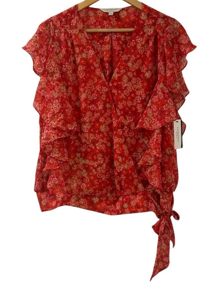In brand new with tags condition. There are no issues or flaws. Top of shoulder to bottom hem measurement is approximately 22 inches. Armpit to armpit measurement is approximately 20 inches. Discover the effortless charm of the Liverpool Los Angeles Women's Blouse in a vibrant berry blossom floral. This chiffon blouse, in a size small, is your go-to for both casual outings and special occasions. The V-neck design and ruffle sleeves add a touch of elegance, while the waist tie ensures a flattering fit. Perfect for pairing with your favorite jeans or a sleek skirt, this blouse offers versatility and style. With an original MSRP of $79, it's a chic addition to any wardrobe. New with tags (NWT). Keywords: Liverpool Los Angeles, women's blouse, berry blossom, chiffon, V-neck, ruffle sleeve, floral pattern, waist tie, size small, casual wear, elegant blouse, versatile top, new with tags. Brand: Liverpool Los Angeles Size: S Color: Red Type: Blouse Department: Women Style: Basic Material: Chiffon Neckline: V-Neck Sleeve length: Short Sleeve Sleeve type: Ruffle Sleeve Pattern: Floral Features: Waist Tie, Ruffled details Country/region of manufacture: Vietnam Item#6719
