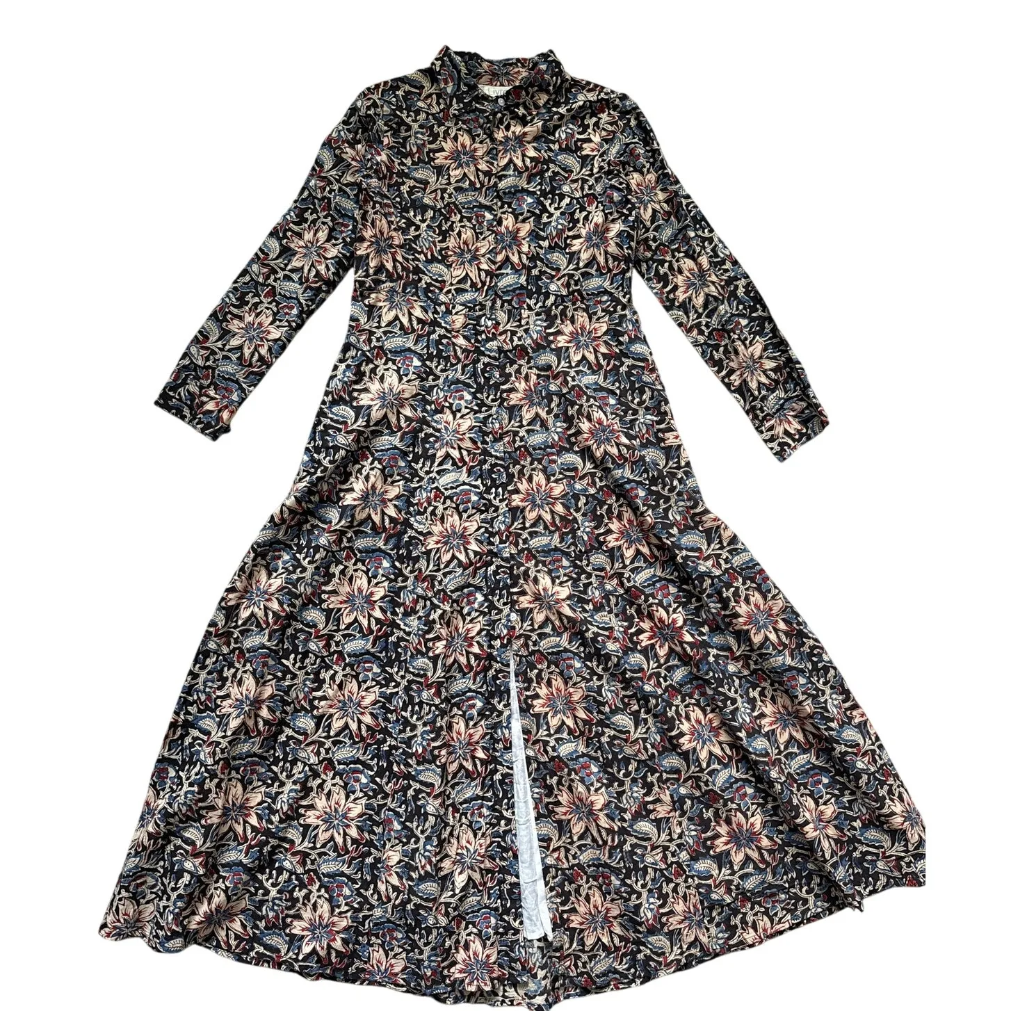 Retails for $228 Excellent like new condition - no flaws or stains Features: Long Sleeve Front Button Closure Collared Neckline Fully lined Maxi Length Floral Print Side Pockets Made in India 100% cotton / machine wash Approximate Measurements - laid flat / no stretch: Bust: 37” / armpit to armpit: 18.5” Waist: 34” Length: 56”