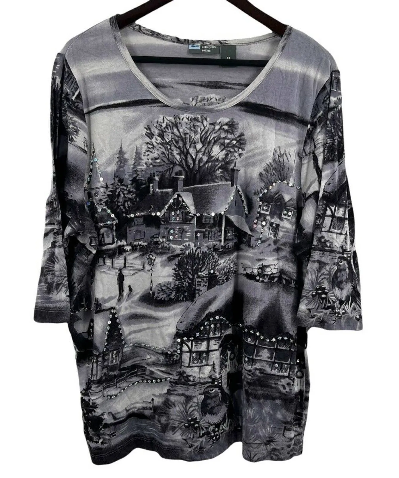 Liz & Me Grey Country Winter Scene Sequined Home Collectors Tee 14/16W. Printed tee in a snowy country home theme Sequined accents Longer length short sleeves Very good preowned condition Armpit to armpit 22" Length 29"