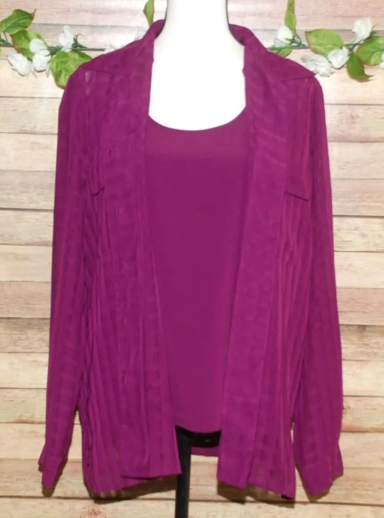 This elegant Liz Baker set includes a purple sheer blouse with button-up detail and a matching tank... Show more