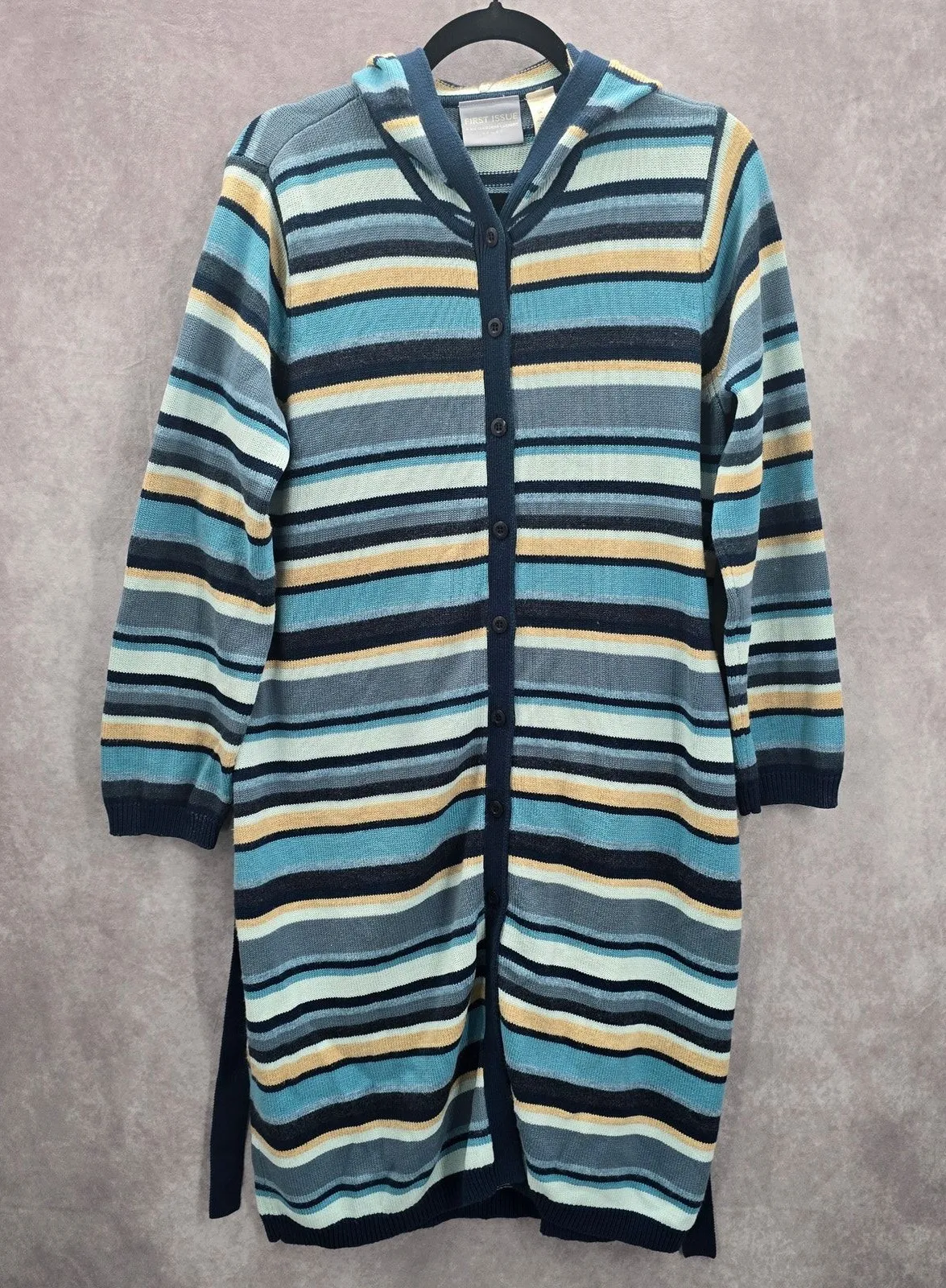 Liz Claiborne Blue Stripe Button Hoodie Knit Long Sweater Cardigan Small PTP: 23" Length: 42" Hood... Show more