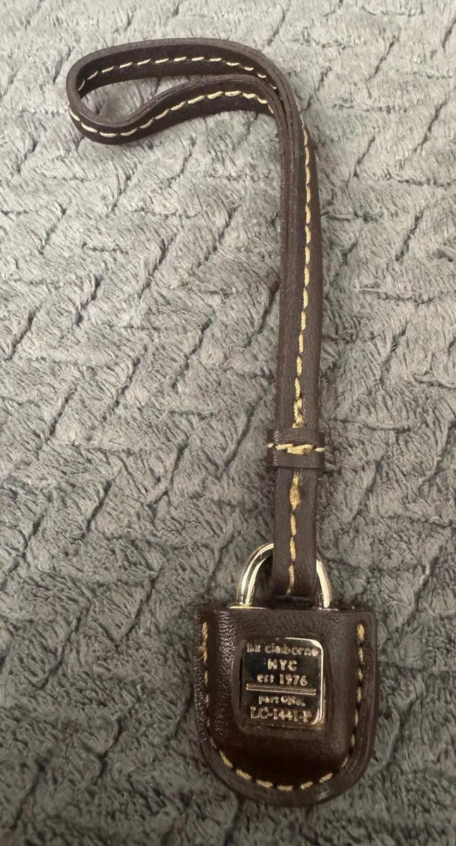 VTG LIZ CLAIBORNE NYC METAL BROWN LEATHER STRAP KEY FOB BAG CHARM KEYCHAIN HANG TAG Gold hardware 6.... Show more