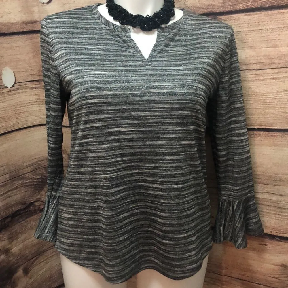 Liz Claiborne black & silver bell sleeve blouse • v neckline • easywear • 22.5” shoulder to hem... Show more