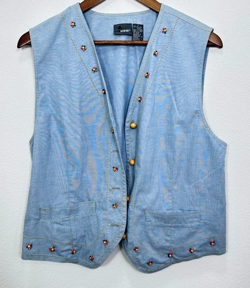 Liz Wear Vintage Chambray Denim Jean Vest Beaded with Wooden Buttons Size M Pre-Owned Vintage in Gre... Show more