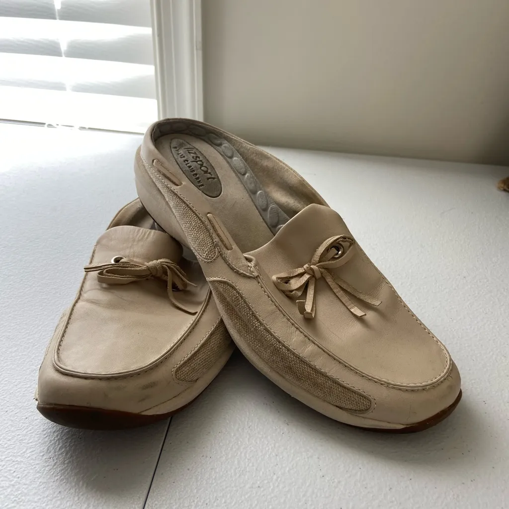 Lizsport women’s tan leather boat slip on mules loafers shoes No size tagged, but measurements indi... Show more