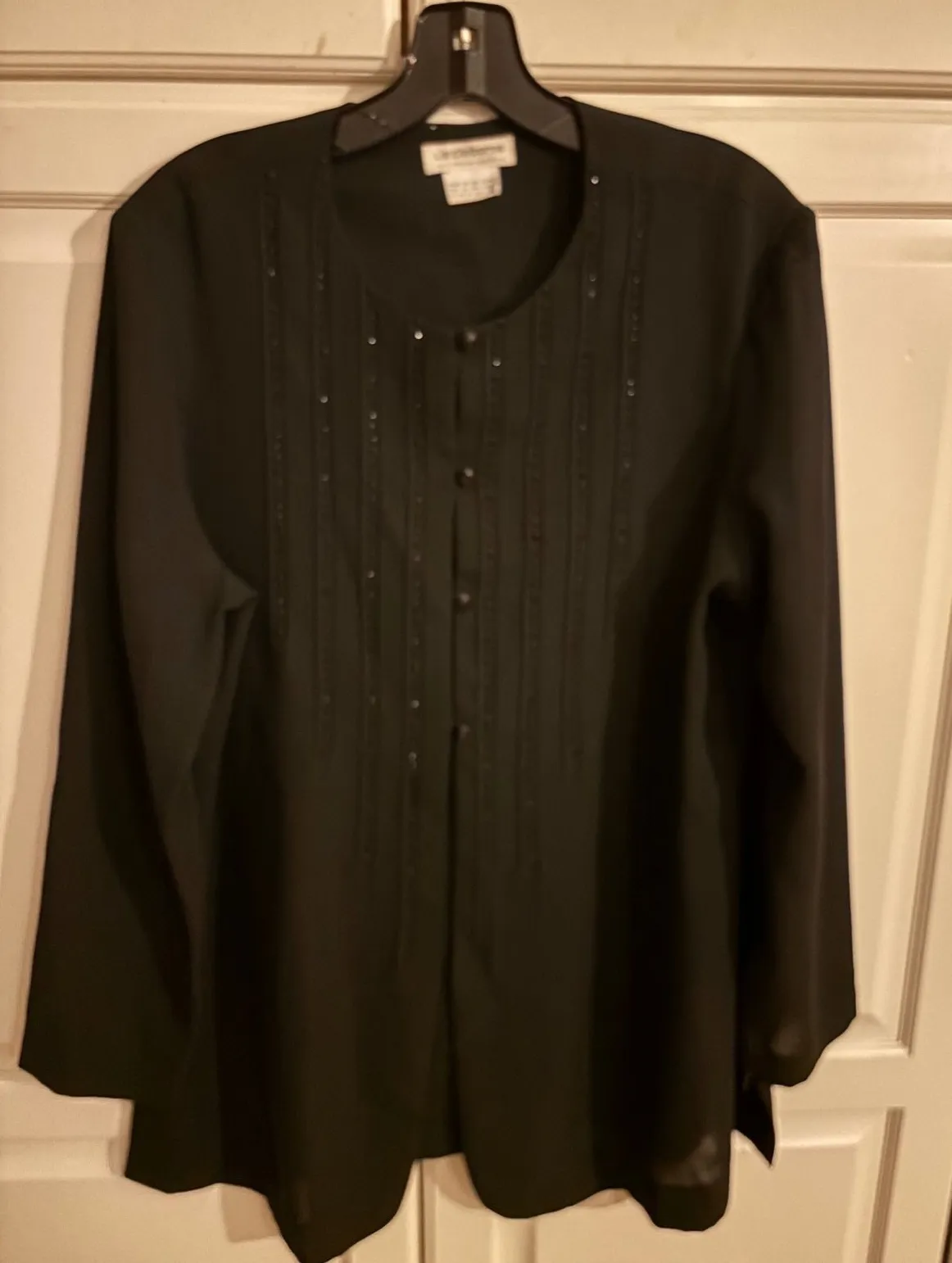 Refined elegance takes center stage with this sophisticated black blouse. Delicate rows of embellish... Show more