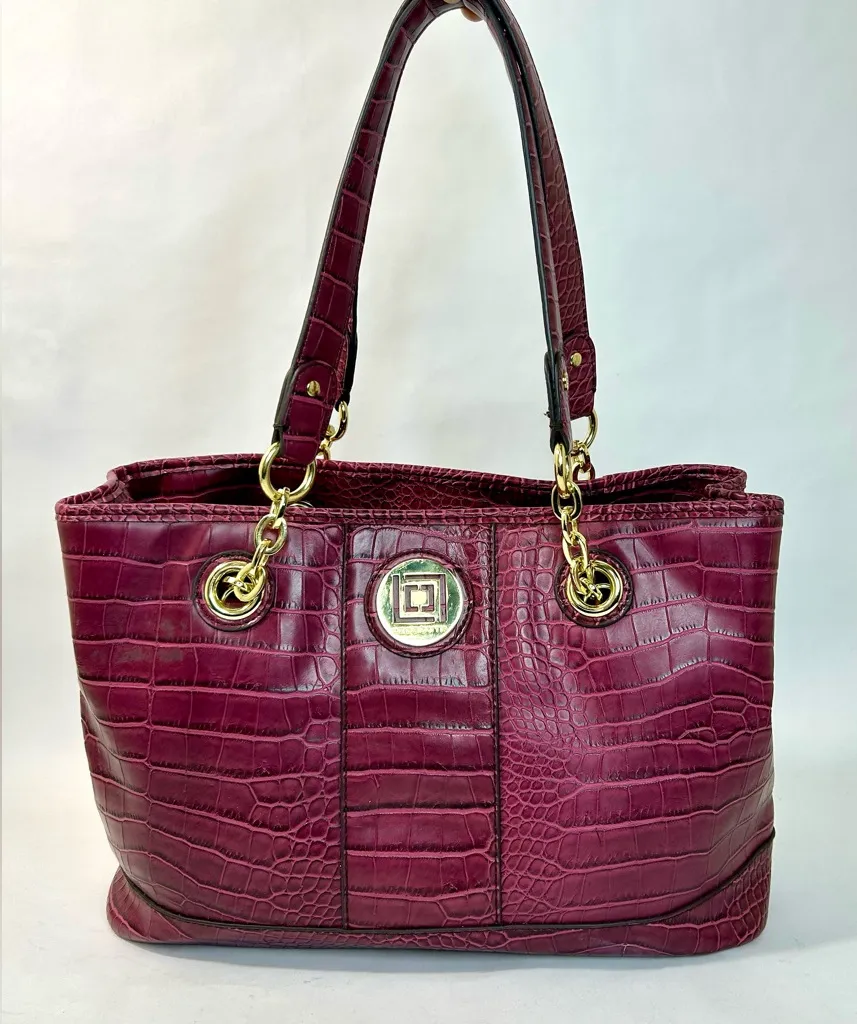 Plum/purple croc embossed faux leather with gold hardware Large zippered compartment on the interio... Show more