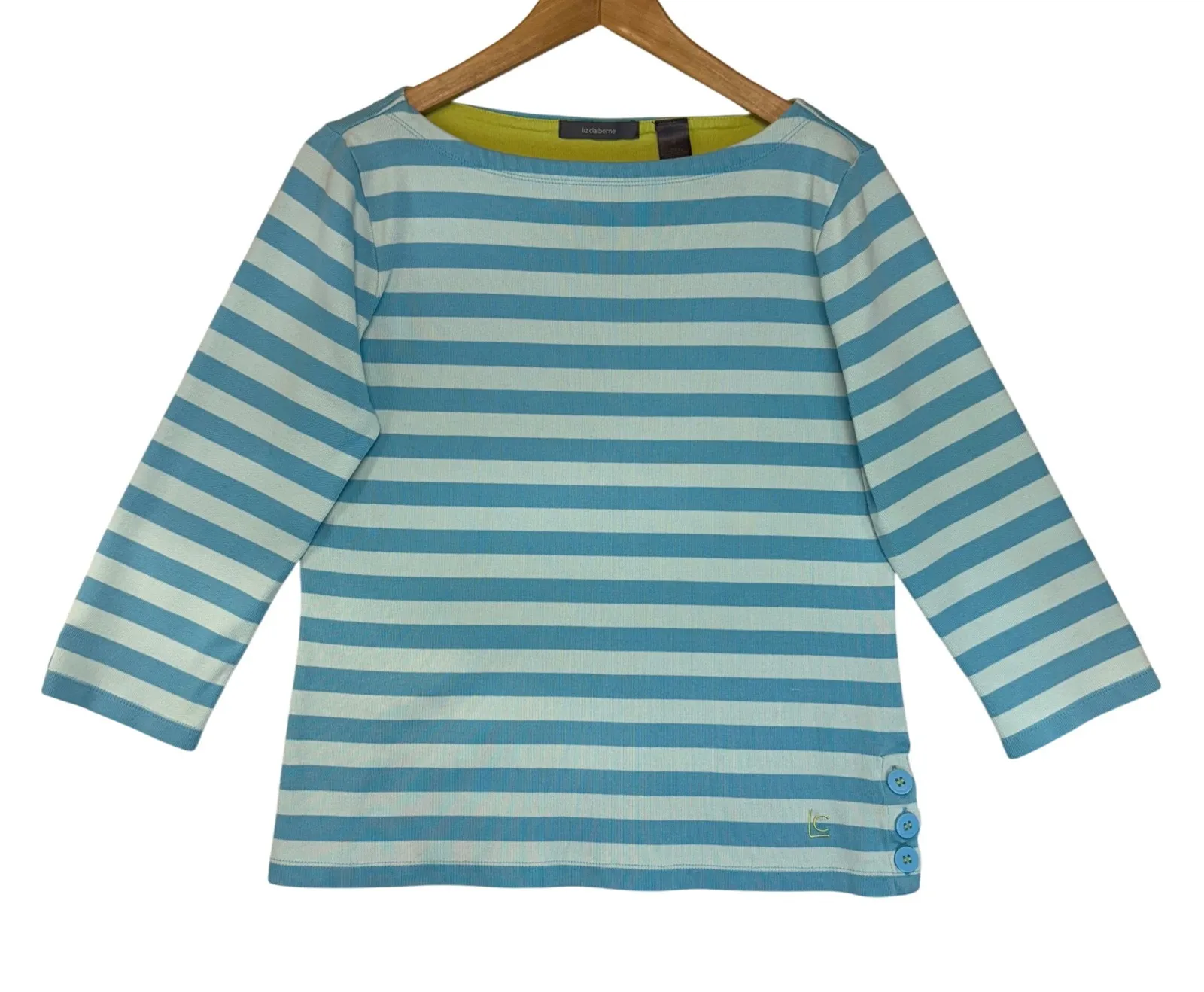 Brighten your wardrobe with this charming Liz Claiborne striped boat neck top. Three-quarter sleeves... Show more