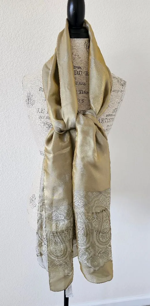 approximately 76" x 20" Add a touch of elegance to your outfit with this beautiful gold paisley sca... Show more