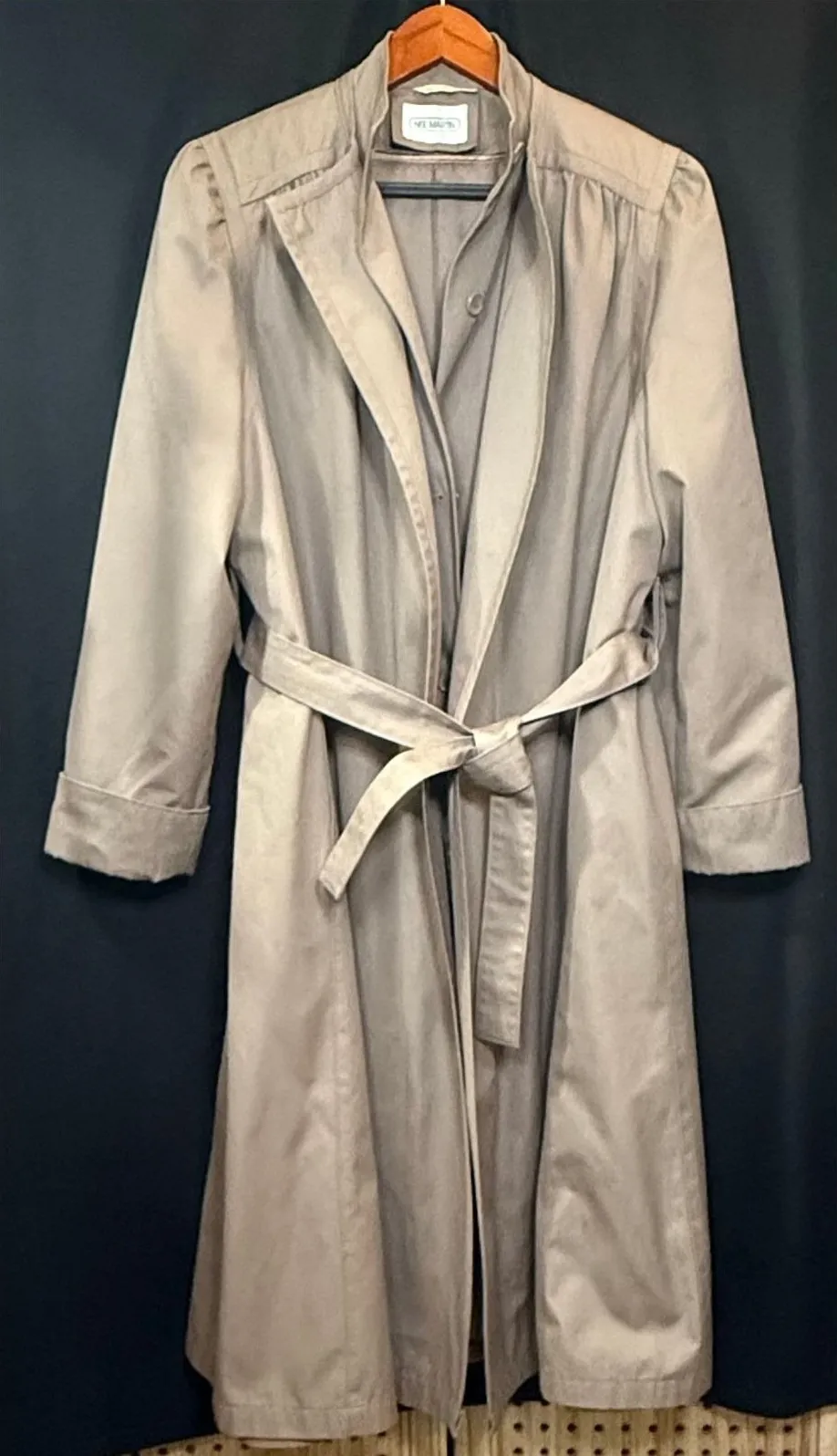 Keywords: trench coat, beige coat, womens coat, long coat, belted coat, classic coat, vintage coat, retro coat, outerwear, ladies fashion, neutral coat, collared coat, Liz Claiborne