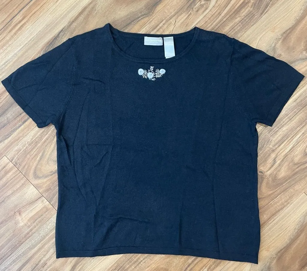 Chic navy sweater tee with an adorable embroidered floral detail. 72% silk. Incredibly soft thanks t... Show more