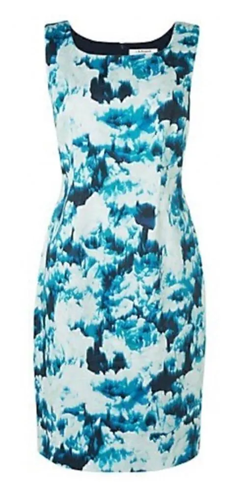 This Dr. Roxette knee-length dress by LK Bennett. Size 8 Designed with a structured fit, square neck and a sleeveless arm detail, it's perfect for lending your work wear a feminine flair. *watercolor blue white print * fully lined * zipper back Material is 98% cotton, 2% elastane which gives the dress a bit of stretch making it more comfortable to move around.