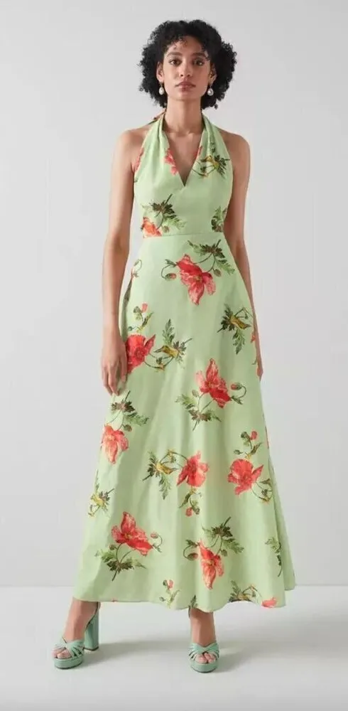L.K. Bennett Kristen Gown - Size 2 Good preowned condition Color: Green MSRP: $575 NOTE: mended area near side seam We'll let you into a secret, we love a floral print... and this spring we've gone supersized with our 1930's hand painted giant poppy print. Reimagined by our print designer and splashed onto the Kristen backless dress in soft pistachio green and delicious raspberry pink, it's made from a luxurious cotton-silk blend and has a Seventies' feel to it. A V-front maxi with a tie-up halterneck - tie it at the back or to the side - it has a back zip, a body-skimming flared shape and falls to the ankle. Pick up on that pinky red with your accessories. A-line Sleeveless V-neck Back zipper closure 70% Cotton, 30% Silk Imported tags: designer, nordstrom, maxi, a-line, floral, feminine, halter, elegant, evening, party, cocktail, wedding guest Size: Womens 2 Condition: Pre-Owned Good