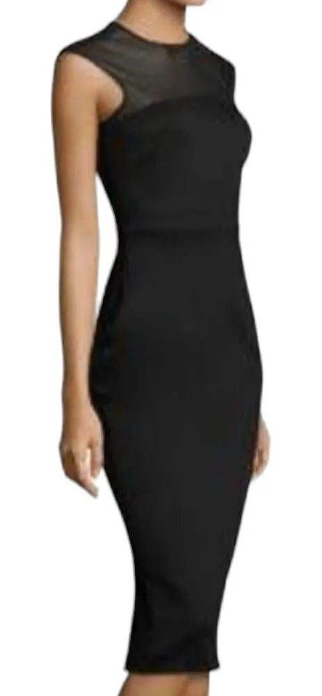 Sleek sheath with asymmetrical illusion neckline Cap sleeves Seamed waist Concealed closure at back keyhole Concealed back zip Back vent About 46" from shoulder to hem Viscose/polyamide/elastane Dry clean Pit to pit 16.75” Waist 15” 43.5” length Excellent condition 0982-23