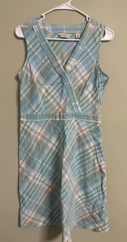 LL Bean Dress Size 12 Linen Cotton Blue Green Plaid V-Neck A-Line Spring Casual - $25 - From Ashlee