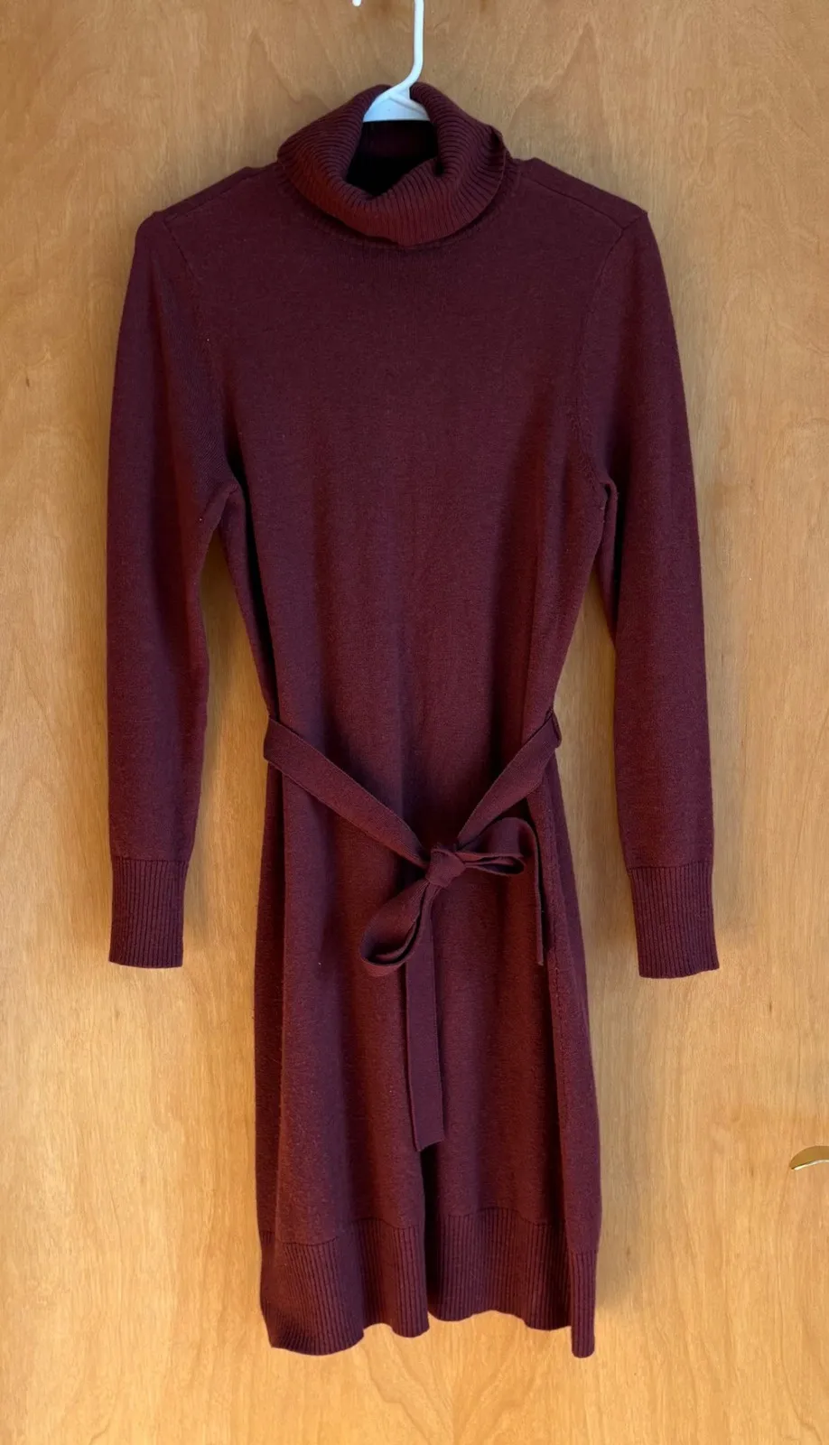 Wrap yourself in cozy elegance with this LL Bean merino wool and cotton blend sweater dress. The rich burgundy hue and classic turtleneck design offer timeless sophistication, while the included self-tie belt cinches your waist for a flattering silhouette. The soft, breathable blend provides exceptional comfort and warmth, making it perfect for layering or wearing on its own. Ideal for a casual day out, a relaxed office environment, or a cozy evening gathering. Measurements: • Chest (pit to pit): 18 in • Waist (laid flat): 17 in • Sleeve length (shoulder to cuff): 23 in • Total length (shoulder to hem): 37 in Style: Sweater Dress Dress Length: Knee Length Department: Women Sleeve Length: Long Sleeve Pattern: Solid Occasion: Casual Material: Merino Wool, Cotton Fabric Type: Knit Neckline: Turtleneck Season: Fall, Winter Garment Care: Hand Wash Only Country of Origin: China Keywords: LL Bean, merino wool, cotton blend, turtleneck dress, sweater dress, burgundy, belted dress, fall fashion, winter wear, cozy, classic, comfortable, midi dress