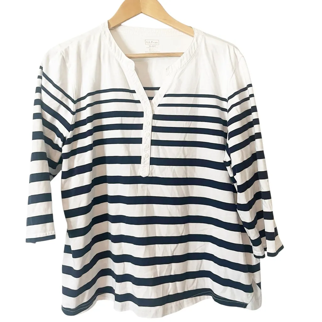 L.L. Bean Navy and White Striped Henley 3/4 Sleeve Cotton‎ Top Size XL Petite - $18 - From KennyLou