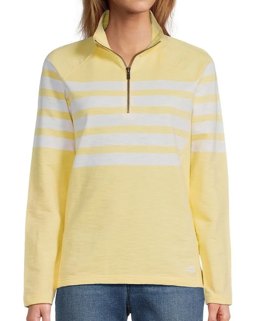 . Excellent condition no issues. Pullover silhouette Mock neckline Long raglan sleeves Front quarter zip Ribbed side panels 100% cotton. See photos for flat lay measurements. Tags: cotton striped preppy casual comfy cozy travel