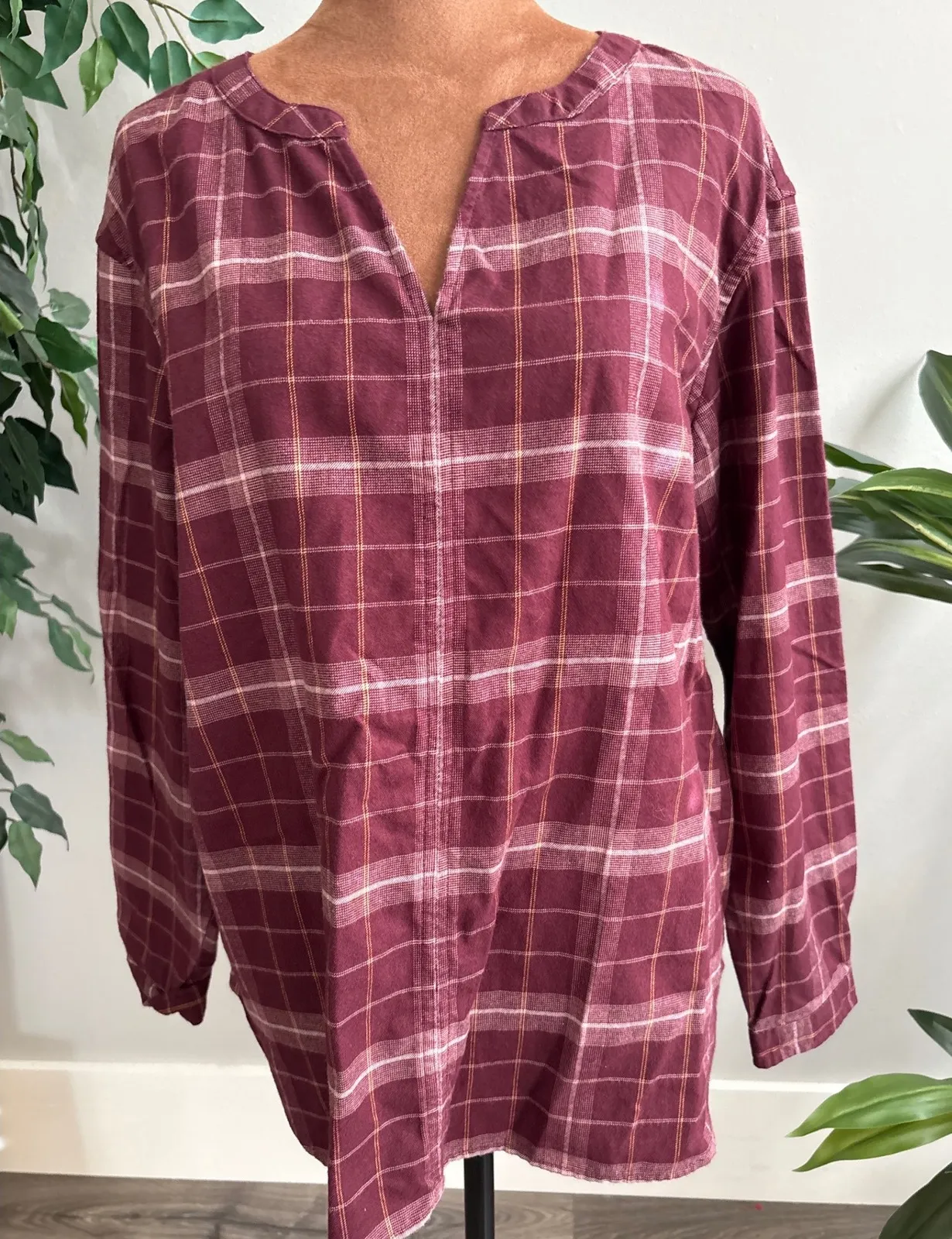 Discover cozy comfort and classic style with this LL Bean plaid tunic shirt. Its rich burgundy hue and timeless plaid pattern create a versatile piece perfect for layering or wearing on its own. The flattering V-neckline and relaxed fit offer an effortlessly chic look, while the long sleeves provide warmth and coverage. Embrace a laid-back vibe for weekend errands or cozy up by the fire on a chilly evening. Measurements: • Bust: 22 in • Length: 28 in Iwo Type: Blouse Department: Women Style: Tunic Neckline: V-Neck Sleeve Length: Long Sleeve Sleeve Type: Classic/Fitted Sleeve Pattern: Plaid Accents: Button Features: Keyhole Neck Fit: Relaxed Fabric Type: Flannel Occasion: Casual Closure: Pullover Season: Fall, Winter, Spring Country of Origin: Sri Lanka Unit Type: Unit Keywords: LL Bean shirt, plaid tunic, burgundy top, women's casual wear, long sleeve shirt, V-neck top, fall fashion, cozy shirt, everyday wear, outdoor apparel, classic plaid, relaxed fit