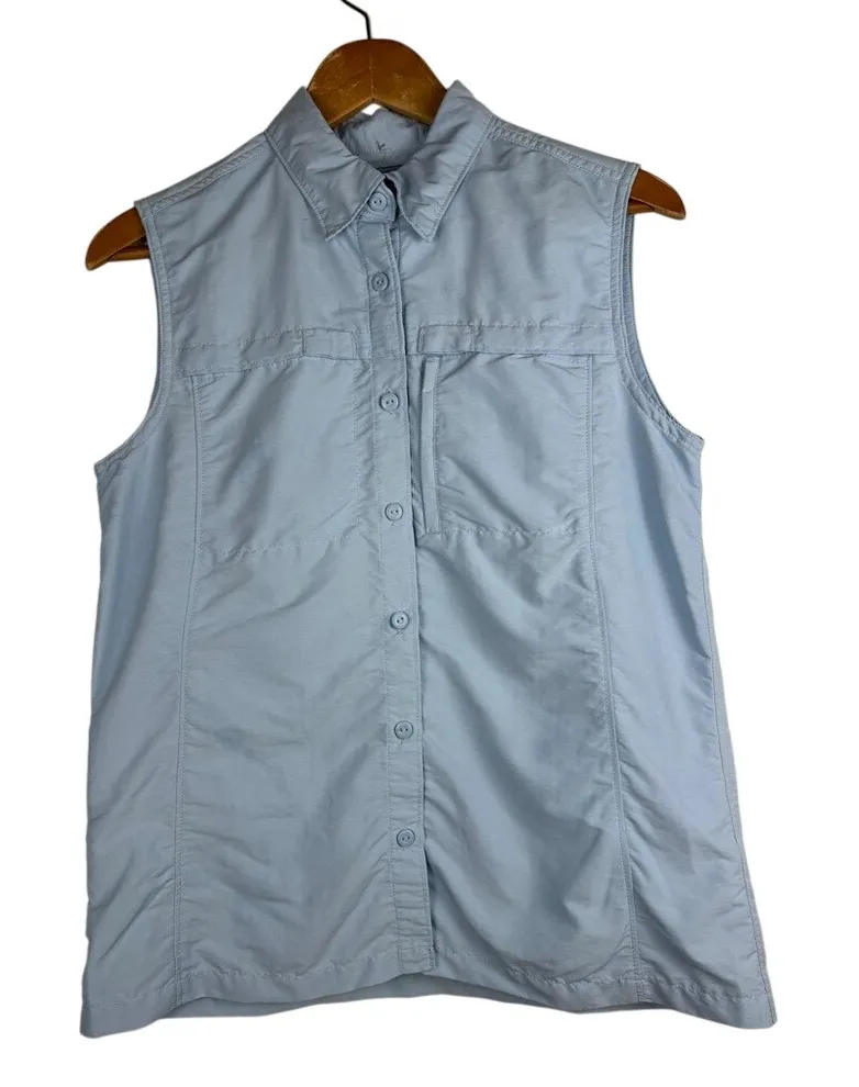 LL Bean vented sleeveless shirt / tank top in the size women's medium. The color is a light blue. This shirt is vented, so it is perfect for outdoor activities such as hiking, fishing, etc. It is a nylon polyester blend, so it is a lightweight top and it is a full button up closure. It is in excellent preowned condition with no flaws to note. Approximate lay flat measurements: Length: 25" Pit to pit: 19" *from a smoke free home