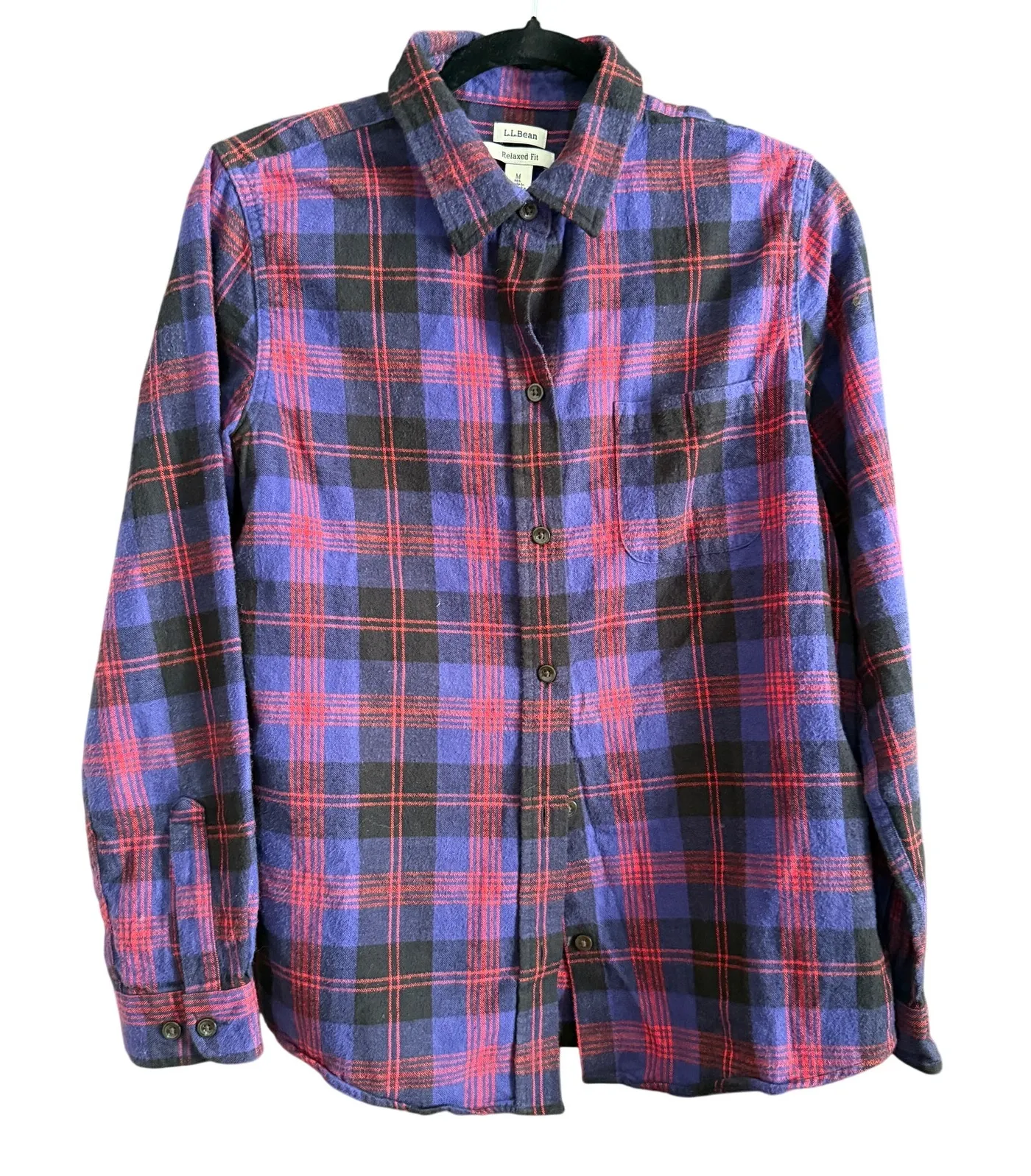 L.L. Bean | Women's Relaxed Fit Blue Purple Red Plaid Flannel Shirt 100% Cotton Soft Mid-weight Flannel Purple, Blue, Red, and Black Plaid Relaxed Fit Button down Excellent condition - no flaws Women's Size Medium Lay-flat measurements: Chest, pit-to-pit: 22 inches Length, center back: 26 inches