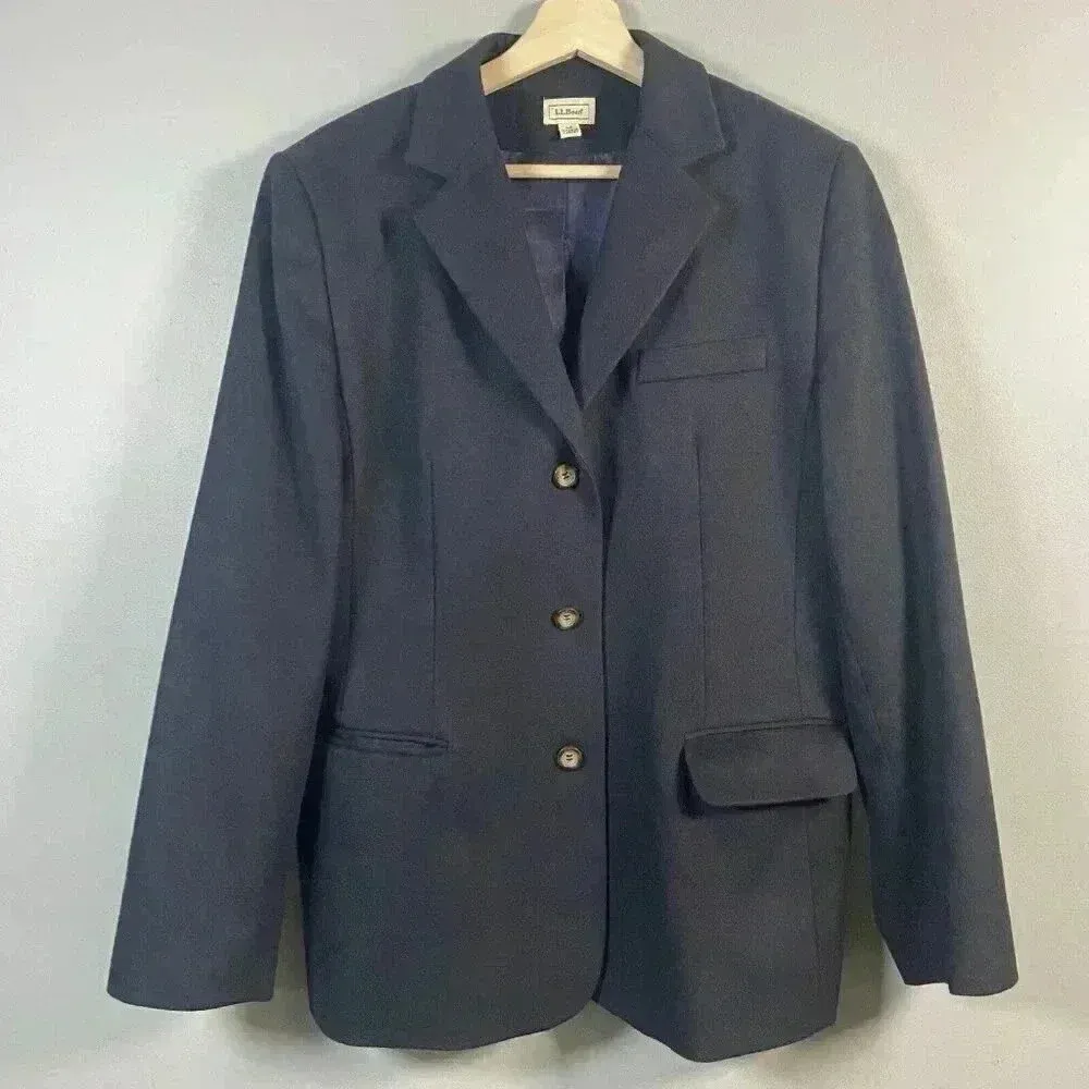This LL Bean blazer is a timeless piece for any wardrobe. Made of wool cashmere tweed, it features a button closure and long sleeves. The mid-length jacket is perfect for fall, winter, and spring seasons. It comes in a solid navy blue color with accents of buttons and pockets. The blazer is perfect for various occasions such as travel, casual wear, workwear, and business attire. The jacket is lined with acetate and has a regular fit. It is a great addition to any outfit and is perfect for those who love money, USA, geek, holiday, dad, teacher, outdoor, city, classic, and preppy themes. —See photos for measurements—. No flaws