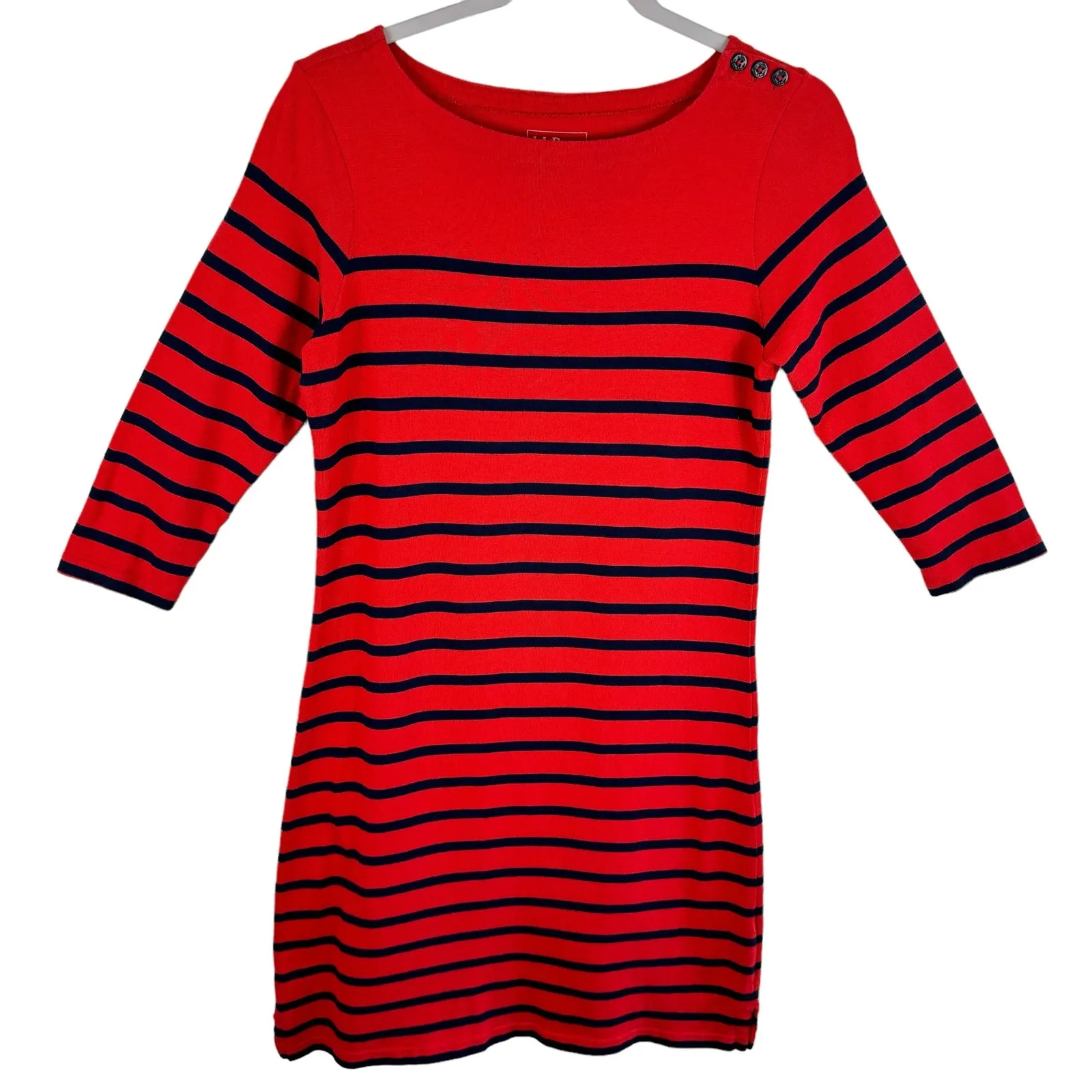 Excellent preowned condition. Red & navy blue striped 3/4 sleeve round neck tight knit pullover swea... Show more