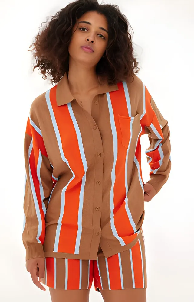 LMND Womens Preppy Carmen Striped Cashmere Blend Collared Knit Sweater Shirt in Grenadine Toffee and Ceramic. Size Small. Good preowned condition. No visible flaws. - Striped - Mid-weight Cozy Knit - Collared - Long Sleeves - Oversized Relaxed Fit - Chest Pocket - Button Front Closure - 95% Cotton, 5% Cashmere Tags- Fall Preppy Lounge Travel Work Approximate Measurements While Laying Flat: Pit To Pit: 21" Length: 26.5" All Items Come From A Smoke Free Home ! All Reasonable Offers Welcome !