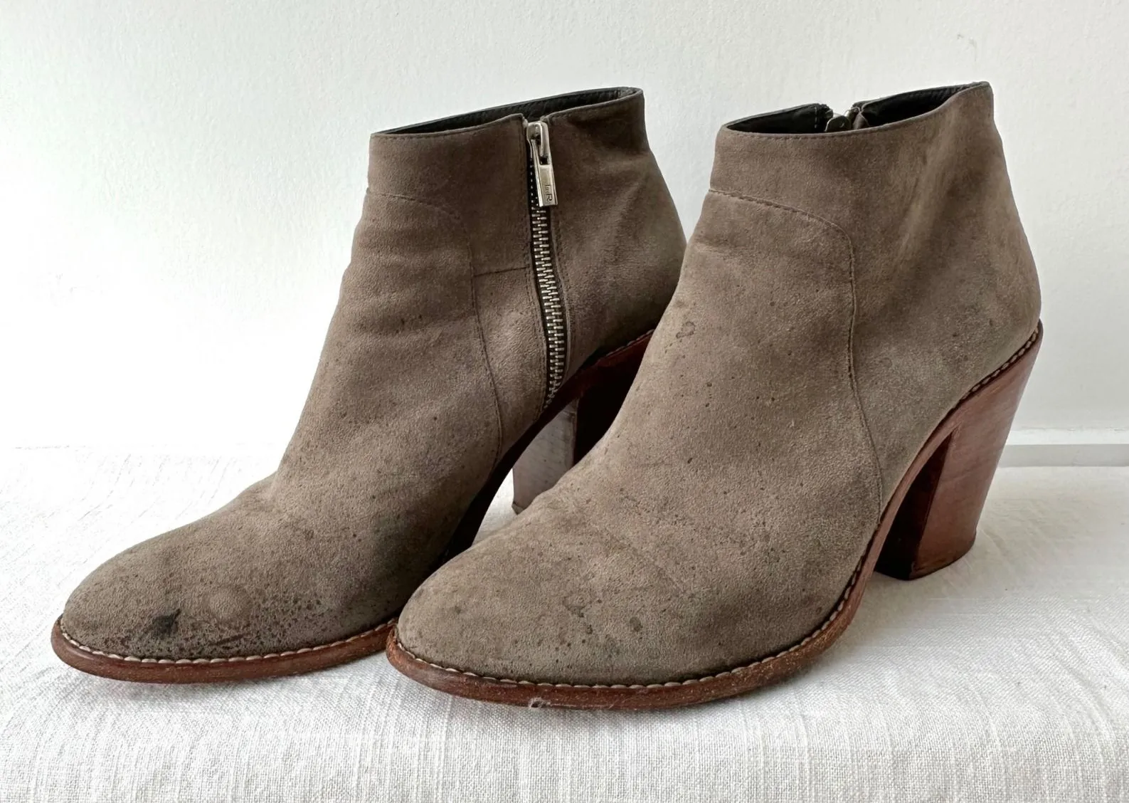Some water marks on the leather as seen in image. Measurements: • Heel Height: 3 in Style: Bootie Department: Women Upper Material: Suede UK Shoe Size: 7.5 AU Shoe Size: 8.5 Shoe Shaft Style: Ankle Lining Material: Fabric Insole Material: Leather Outsole Material: Leather Heel Style: Block Heel Height: High (3-3.9 in) Occasion: Casual Toe Shape: Almond Toe Type: Boot Keywords: Loeffler Randall boots, suede ankle boots, block heel boots, zip closure boots, taupe boots, women's size 10, designer boots, fashion boots, everyday boots, fall fashion, winter wear, casual chic