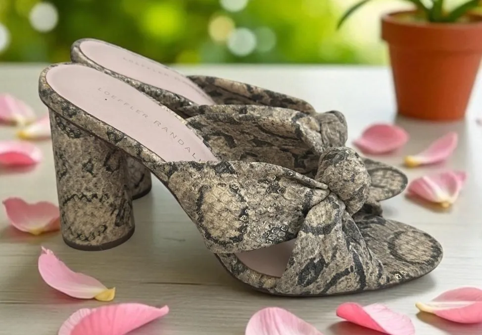 Step into style with these LOEFFLER RANDALL Snake Print Leather Knot Sandals. Perfect for any occasi... Show more