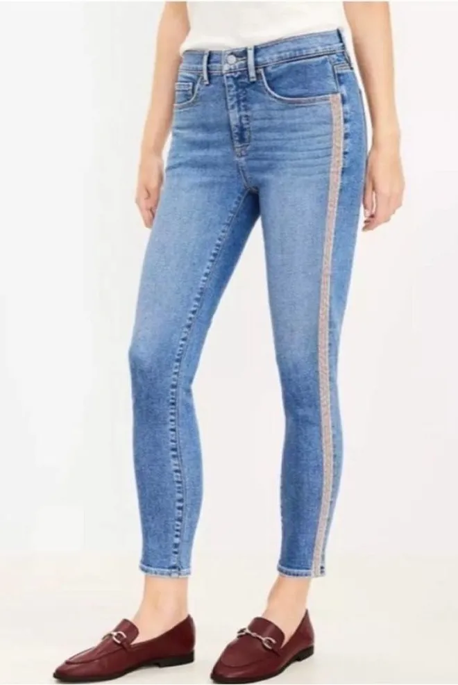 These LOFT skinny jeans in a classic blue shade feature a modern side stripe for a chic look. The ta... Show more