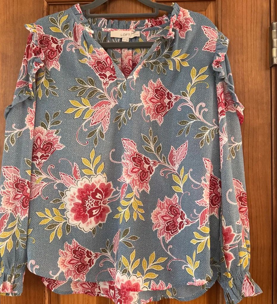 Loft Blouse Top Women’s Petite Small Blue Floral Ruffle V Neck Shirt Girly Pink - $24 - From Crystal