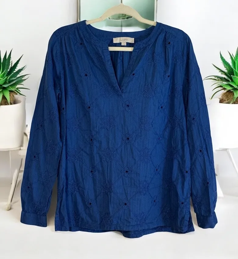 LOFT Blue Eyelet SMALL Embroidered Long Sleeve Blouse Top Shirt Womens Embroidered eyelet details l... Show more