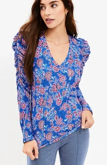Embrace vibrant style with this eye-catching LOFT blouse. The rich blue hue is beautifully adorned with a captivating floral print in shades of pink and white, creating a visually stunning effect. Designed with flattering V-neckline and dramatic puff sleeves, this top adds a touch of sophisticated flair to your look. The unique smocked texture throughout provides a comfortable, textured feel and a flattering silhouette that moves with you. Perfect for a brunch date, a casual day out, or dressing up for an evening with friends.