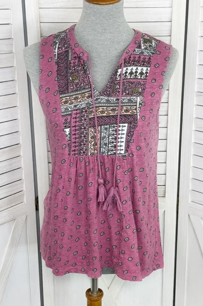 Loft Printed Tassel Neck Sleeveless Top Size XS Mauve pink with allover print Lightweight cotton... Show more