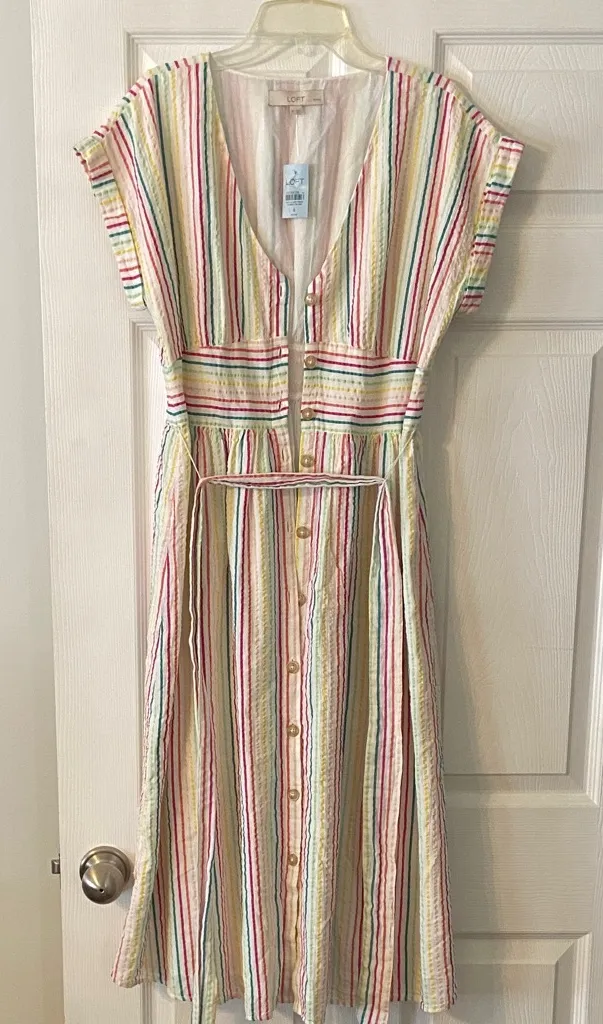 length 45” bust 34” belt around waist Chic midi dress with vibrant stripes. Features a flattering... Show more