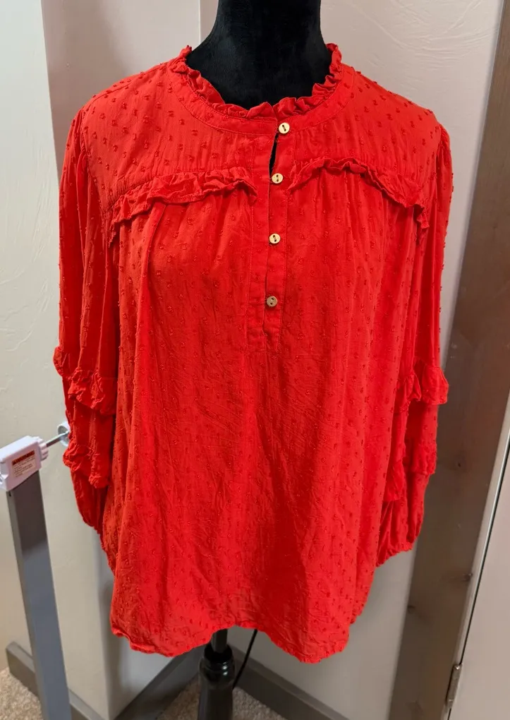 LOFT Coral Bright Orange Swiss Dot Ruffle Detail Long Tiered Sleeve Blouse Half Button XL Excellent... Show more