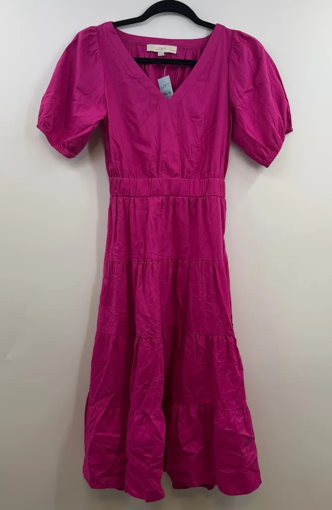 LOFT Midi dress hot fuschia vibrant pink short puff sleeves V-neck Open back cutout XSP NWT New with... Show more