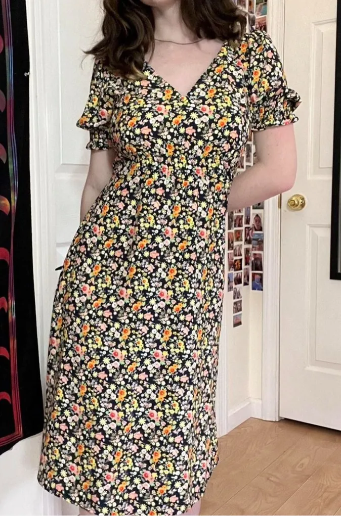 Charming floral dress with short sleeves. Features a colorful floral pattern. Loft midi Floral Short... Show more
