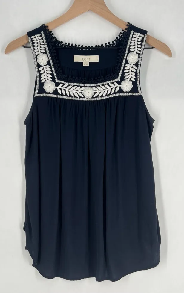 LOFT Navy Square Neck Sleeveless Top with White Floral Embroidery Tank Size XS Stylish dark blue... Show more